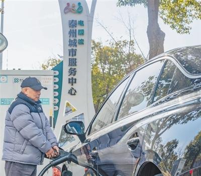我国建周至球最大电动汽车充电集聚。这是一位车主在江苏泰州市的一个电动汽车快充站内为车辆充电。