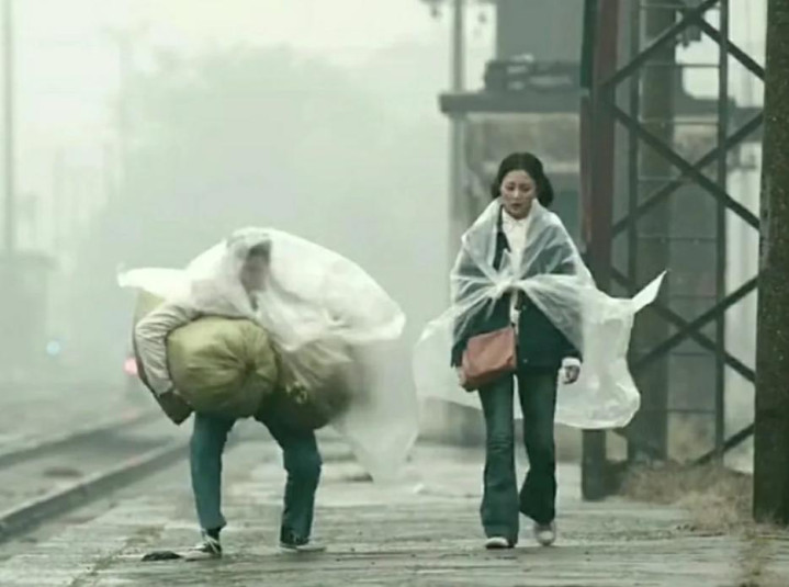 火车站两辆擦肩而过的火车,陈江河拿出写着他们名字的砖头,拚命呼喊骆玉珠,月台上陈江河终于比及了骆玉珠。