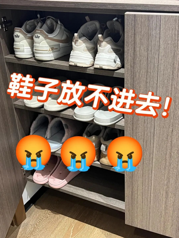 他家的鞋柜作念得太浅,深度不够,搞得统共鞋子放进去后,跟齐露在外面,门关不上,鞋子只可横着摆,根本放不了几双,心态崩了。