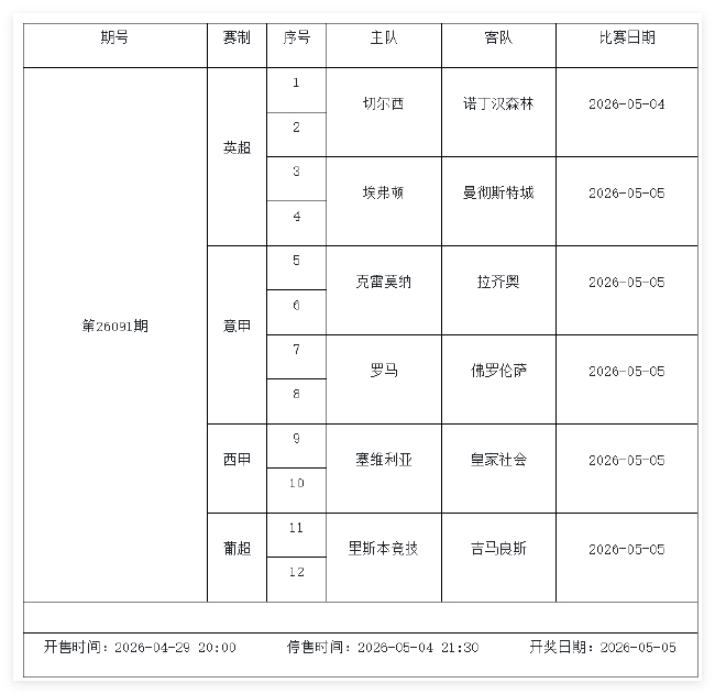 我中心制定了2026年中国足球彩票赢输游戏(14场、任选9场)、6场半全场赢输游戏和4场进球游戏5月1日-5月7日的竞猜场次安排(具体附后),其竞猜对象、开售技艺、停售技艺和计奖技艺均以本文为准。