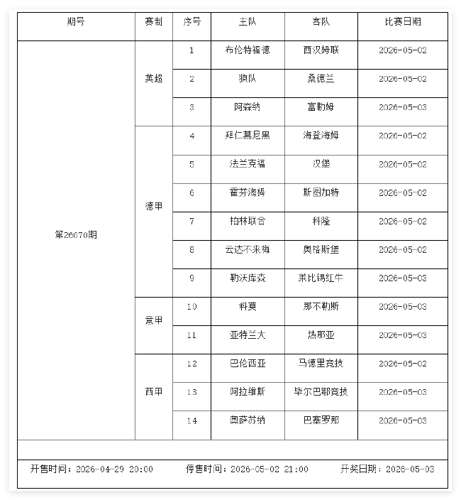 北京技艺2026年4月28日,国度体彩中心公布了2026年5月1日-5月7日的足彩赛程,mg免费游戏试玩平台澳门新浦京5月2日(周六)、5月3日(周日)、5月5日(周二)共3期。其中第26070期由英超、德甲、意甲、西甲赛事构成;第26071期竞猜英超、意甲、西甲、德甲和法甲;第26072期竞猜欧冠、欧协联、欧罗巴、芬超和自若者杯。圆善公告如下: