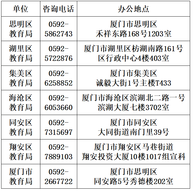 各区退役军东谈主事务局 关系电话 念念明区 0592-5916001 湖里区 0592-2878372 集好意思区 0592-6213695 海沧区 0592-6584027 同安区 0592-7022342 翔安区 0592-7880193安置在厦门市除外的,可由安置地县级及以上退役军东谈主事务部门开具评释。
