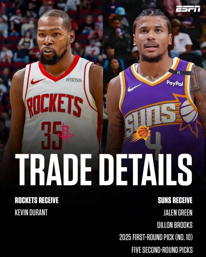 昨年夏天休赛期,火箭送出杰伦格林+狄龙+25届首轮第十号签(马卢阿奇)+5个次轮签,从太阳挖来杜兰特。