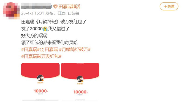 田嘉瑞的2万红包则主打“新东说念主宠粉”,贴合其首部男主剧的定位。