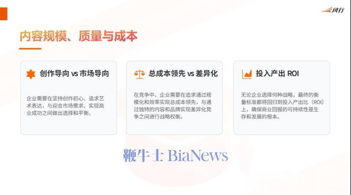 关于大部分从业者来说,可能你莫得这么的资源上风,也许更符合采用各异化计谋。比如实质题材的各异化,立场的各异化,以及面临不同用户群体,作品老本进行各异化。诚然临了人人追求其实都是雷同的——不管作念什么计谋采用,最终追求的都是最优的插足产出比。