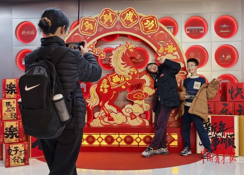 2月14日,北京地安门市集澳门新浦京app,两位小一又友正在“马到告捷”打卡点前拍照眷恋。中青报·中青网记者 陈剑/摄